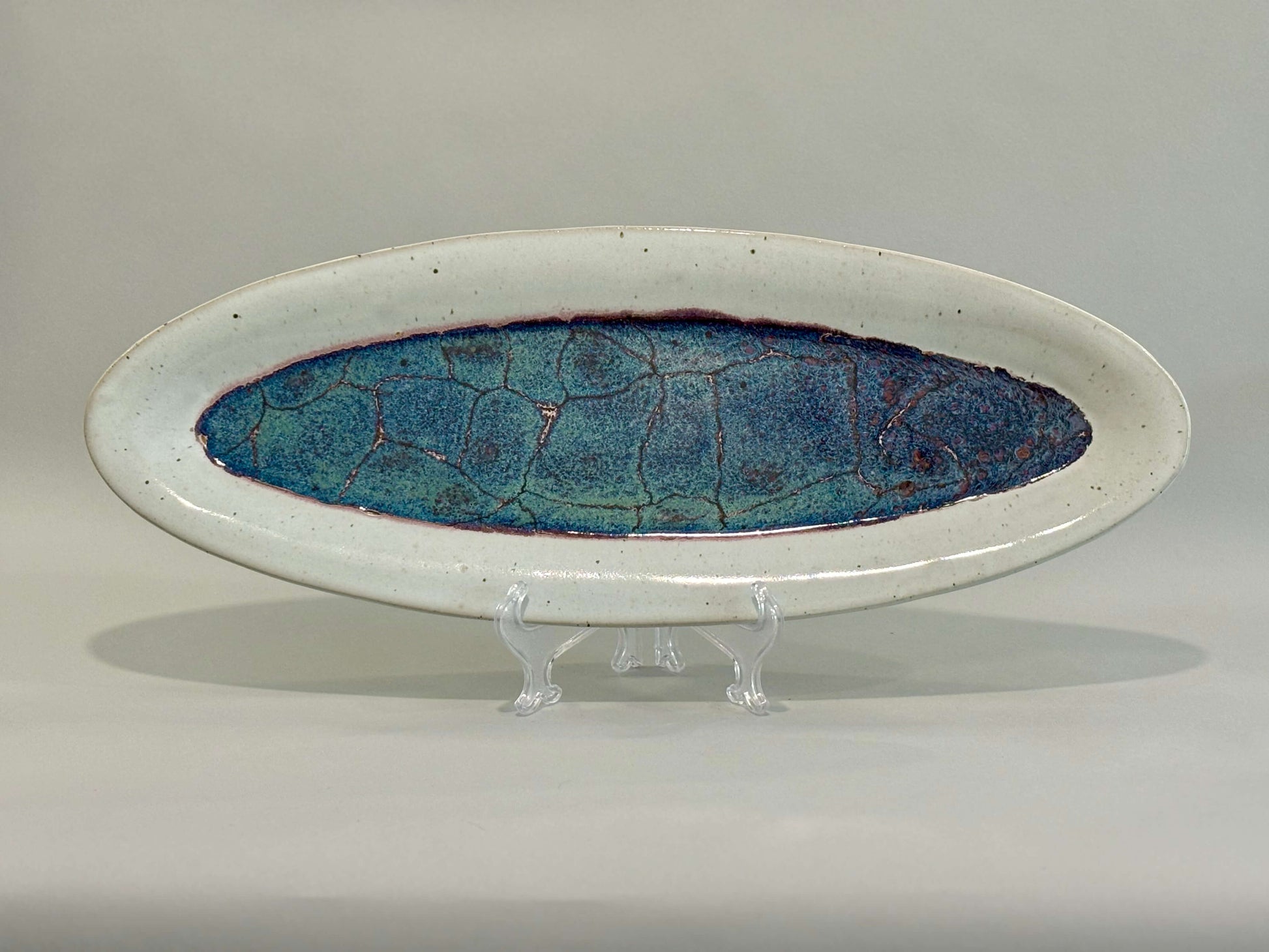These stoneware platters measure 19” x 7” x 1” and make great serving pieces for both hot and cold items. Each is hand-crafted and signed by the artist. They are microwave- and dishwasher-safe.