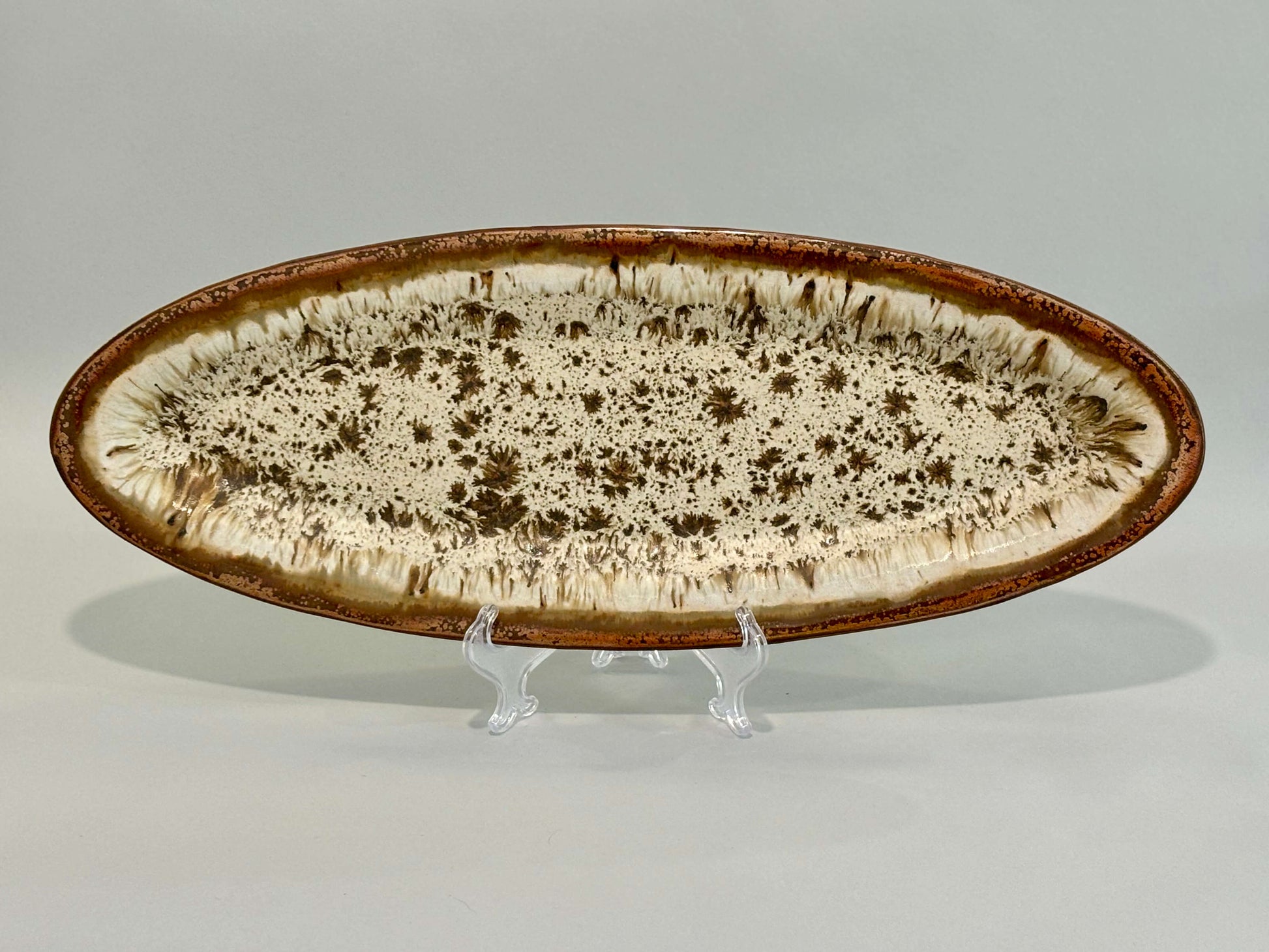 These stoneware platters measure 19” x 7” x 1” and make great serving pieces for both hot and cold items. Each is hand-crafted and signed by the artist. They are microwave- and dishwasher-safe.