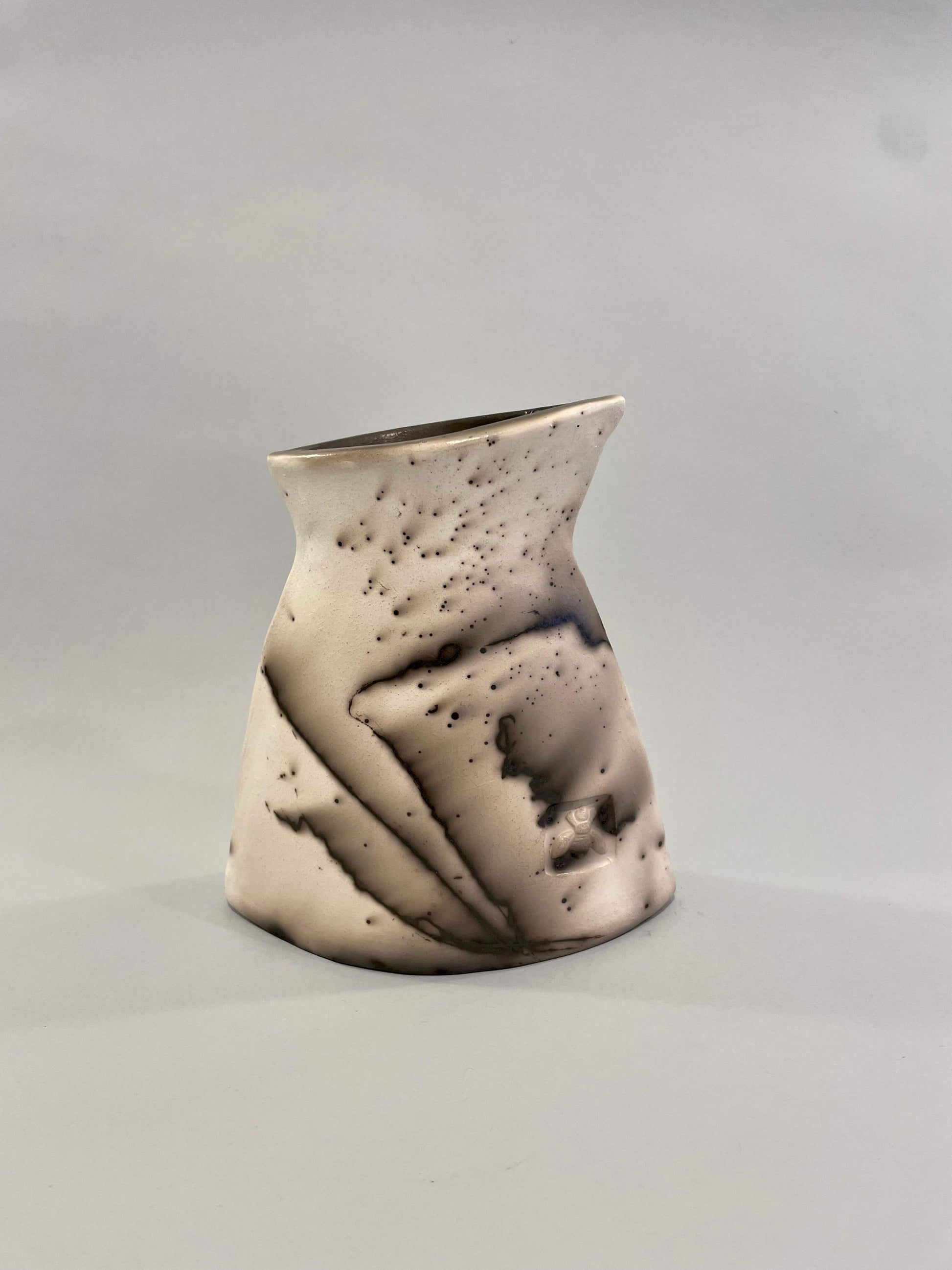 This piece shows the unique pottery technique that combines traditional raku firing with the striking visual effects of horse hair. When the glowing hot vase was removed from the kiln, strands of horse hair were strategically placed on its surface. The intense heat caused the hair to carbonize, leaving unique patterns and markings on the surface and creating dramatic and unpredictable designs. This piece is for decorative use only and is not designed to hold water. It is beautiful as a stand-alone piece or with dried flowers. Due to the nature of handmade ceramics, each piece is unique, and there may be small imperfections. The neutral tone of this piece brings a sense of tranquility to any room. It is signed by the artist and includes the artist’s traditional bee stamp.